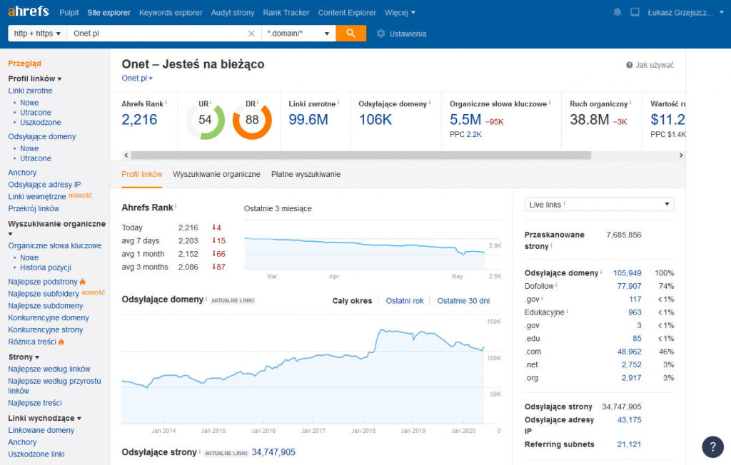 Ahrefs – płatny programy online do analizy backlinków z dodatkowymi funkcjami, których ilość różni się w zależności od wykupionego planu: Lite, Standard, Advanced, Agency. Oprócz możliwości szczegółowego analizowania wszystkich linków danej witryny internetowej, program sygnalizuje problemy on page lub zdublowane strony.
